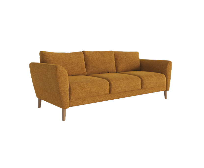 Диван с эффектным силуэтом, который образуют уголок подспинной подушки, подлокотник и ножка. Заметно отклоняясь, подлокотники и посадочные подушки открывают просторное сиденье, акцентируя внимание на внутреннем пространстве дивана. Особый уют создает прилегающая к подлокотнику подспинная подушка оригинальной формы. Кроме обивочной ткани на фото, под заказ доступны обивки из натуральных, синтетических и смесовых материалов. Есть ткани в разнообразных фактурах, трендовых и классических цветах. Некоторые из них устойчивы к грязи и огню.\^ Каркас и пружины Мебель из массива хвойных пород экологична и обладает высокой прочностью, не трескается и не деформируется. Березовая фанера в местах повышенных нагрузок усиливает конструкцию. Стальные зигзагообразные пружины NOZAG расположены в основании горизонтально и обеспечивают эргономичность и износостойкость сиденья. Наполнители Каркасные пружины покрывает слой плотного мебельного войлока. В посадочных подушках пенополиуретан HR средней жесткости. Изготовлен в Финляндии с соблюдением экологических нормативов. Слой синтетического полиэфирного волокна создает аккуратный контур сиденья. Подушки под спину — несъемные. Наполнены холлофайбером. Гладкие волокна скручены в спираль и не сцепляются друг с другом, поэтому подушки сохраняют объем надолго. Материал не удерживает влагу, возникновение микроорганизмов исключено. Ножки Деревянные конусообразные ножки высотой 15 см, в оттенке: • орех