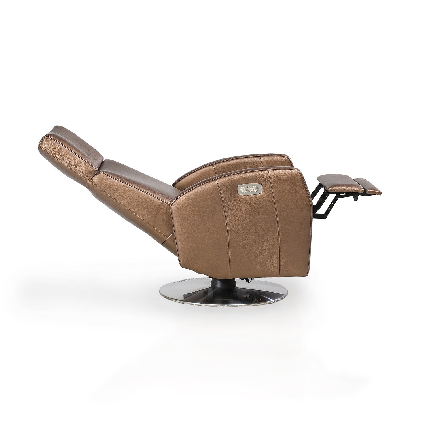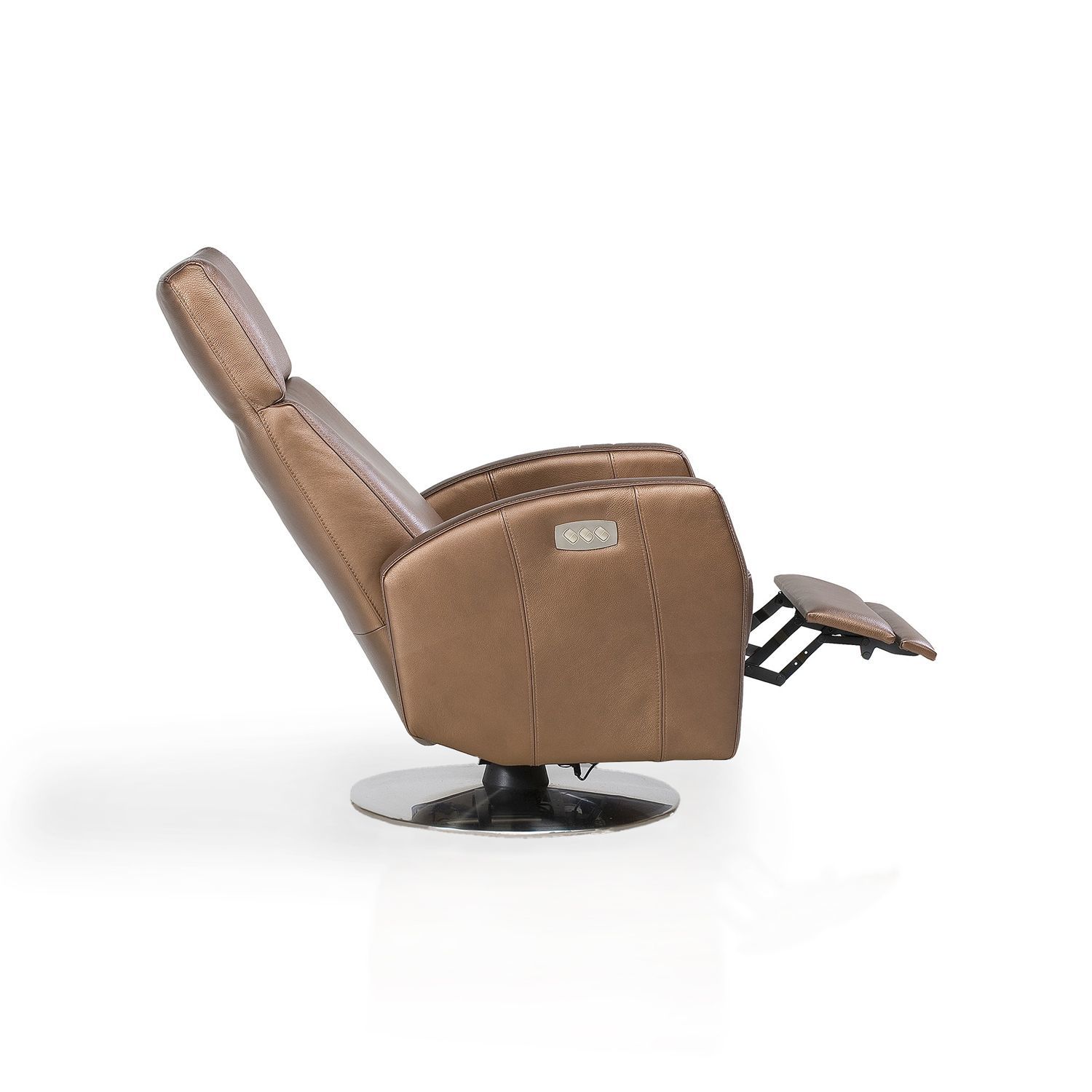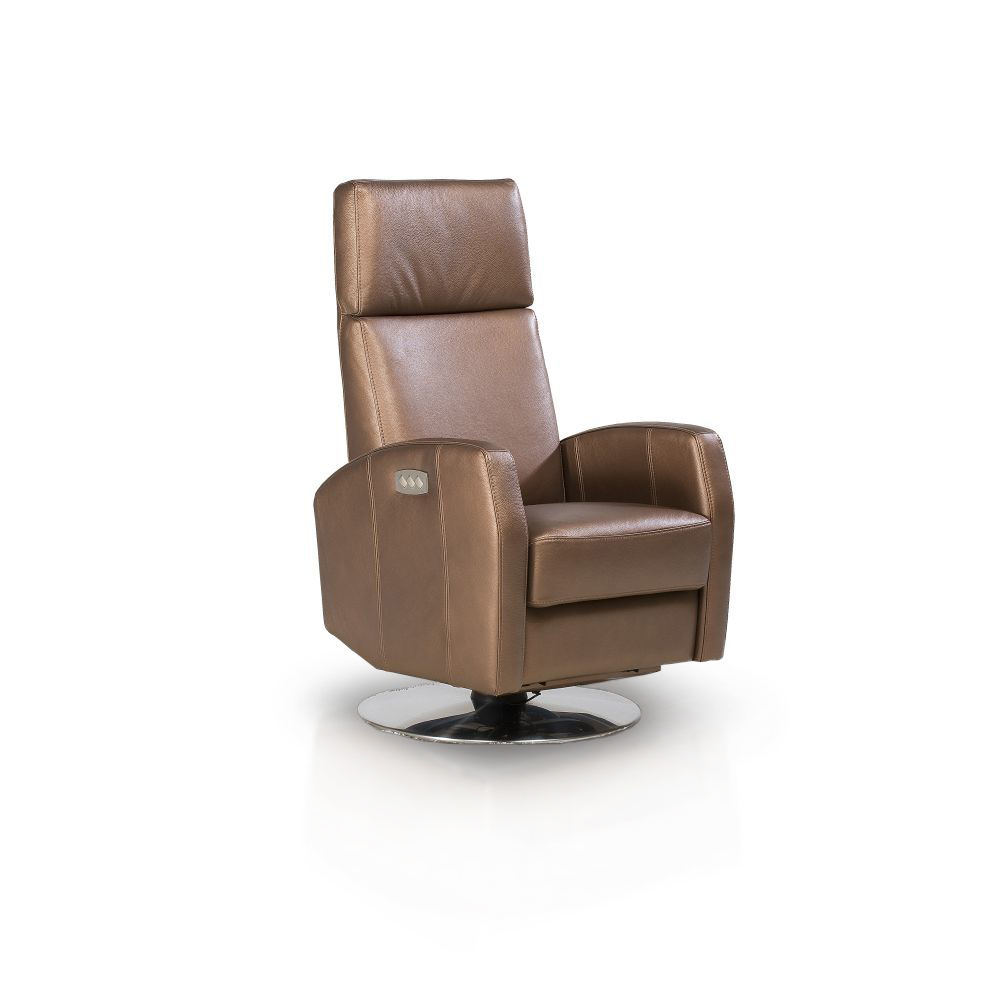 Классическое кресло-реклайнер на открытой вращающейся ножке отличается строгими формами, эргономичной посадкой и управлением на электроприводе.