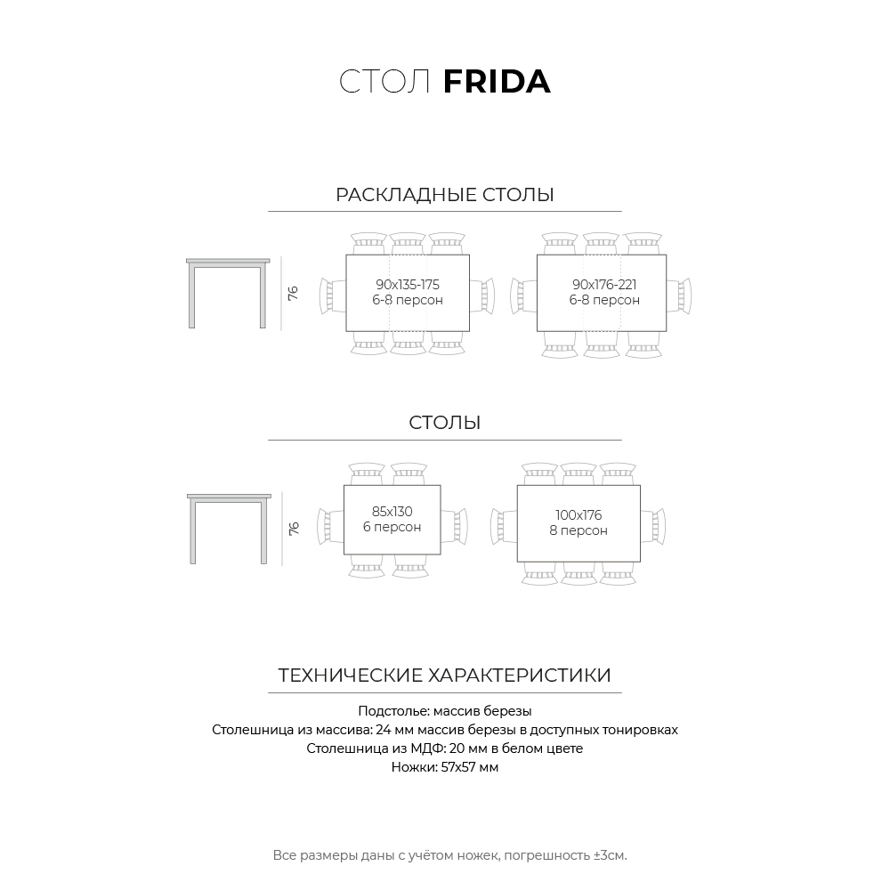 Столы и стулья FRIDA изготавливают из массива берёзы в пяти оттенках тонировки. Столы FRIDA представлены в четырёх размерах, две модели имеют функцию раздвижной столешницы. Стулья могут быть в текстильной или кожаной обивке или исполнены без неё.
