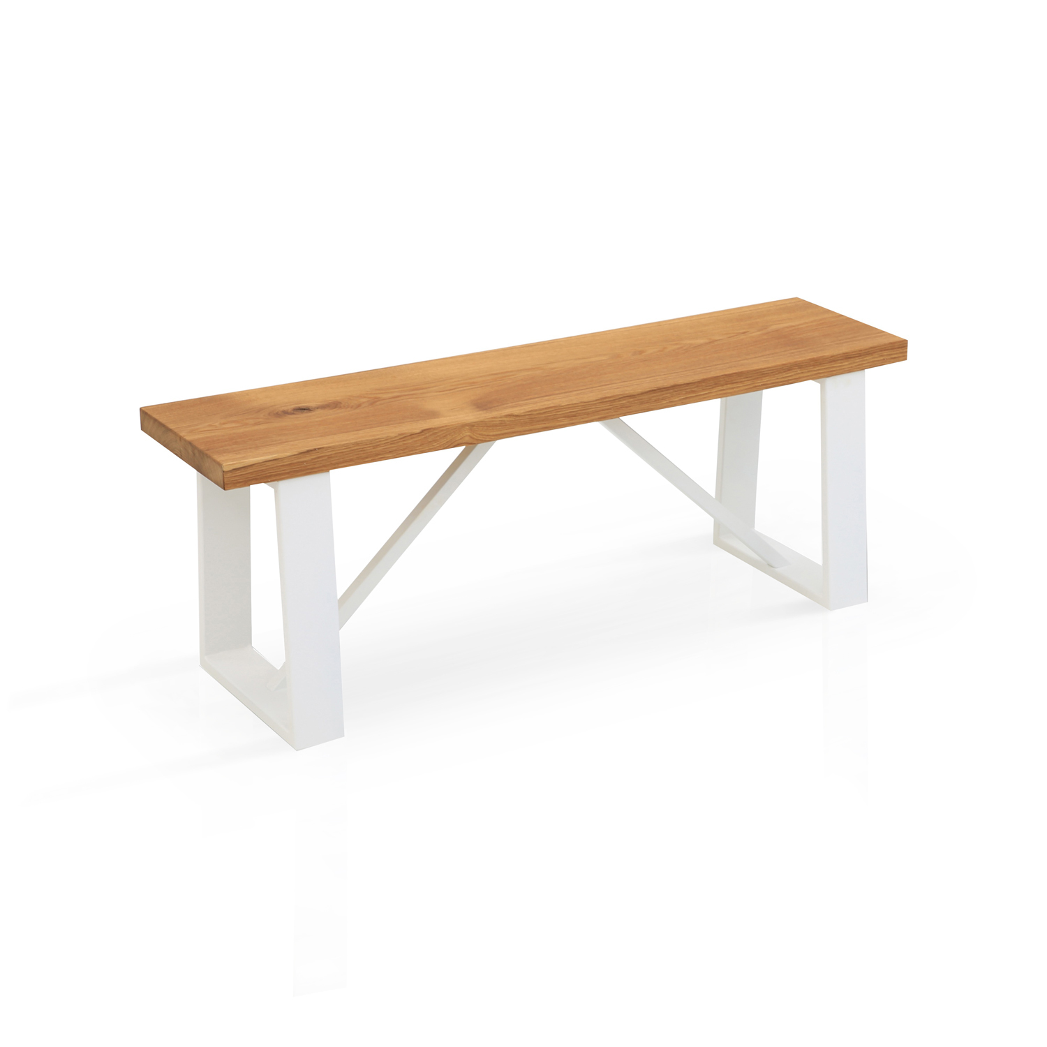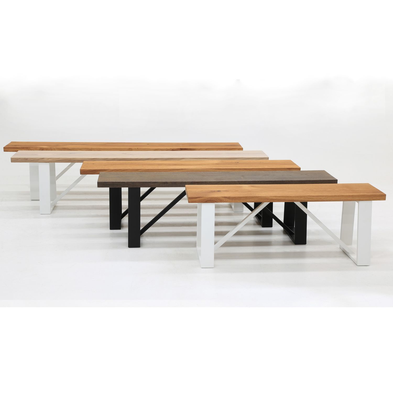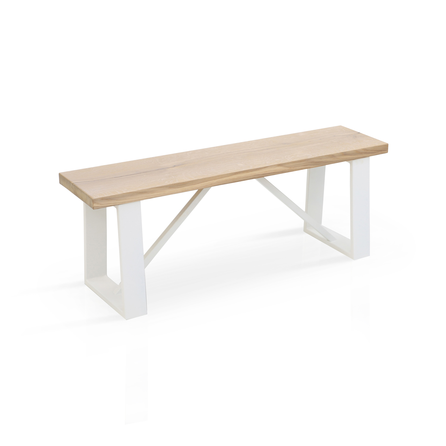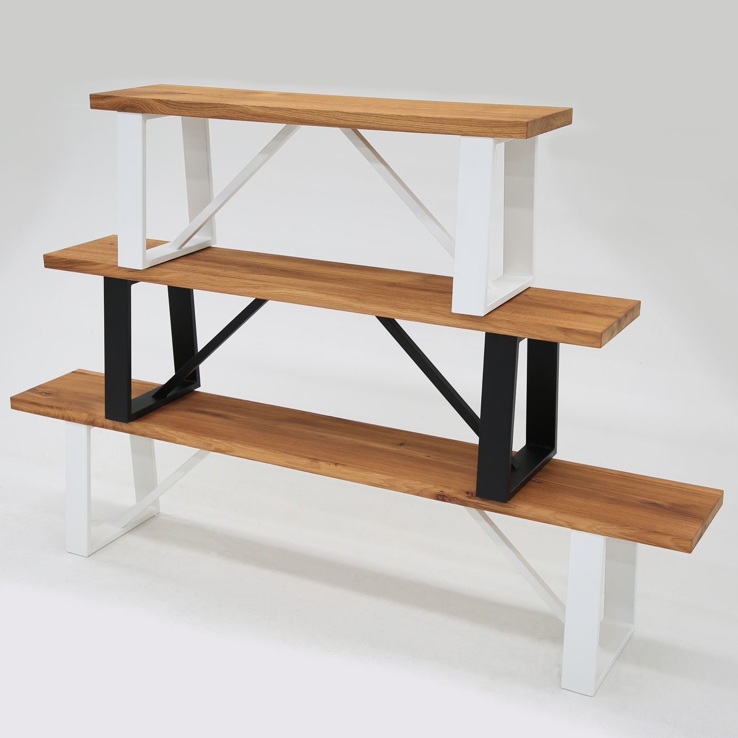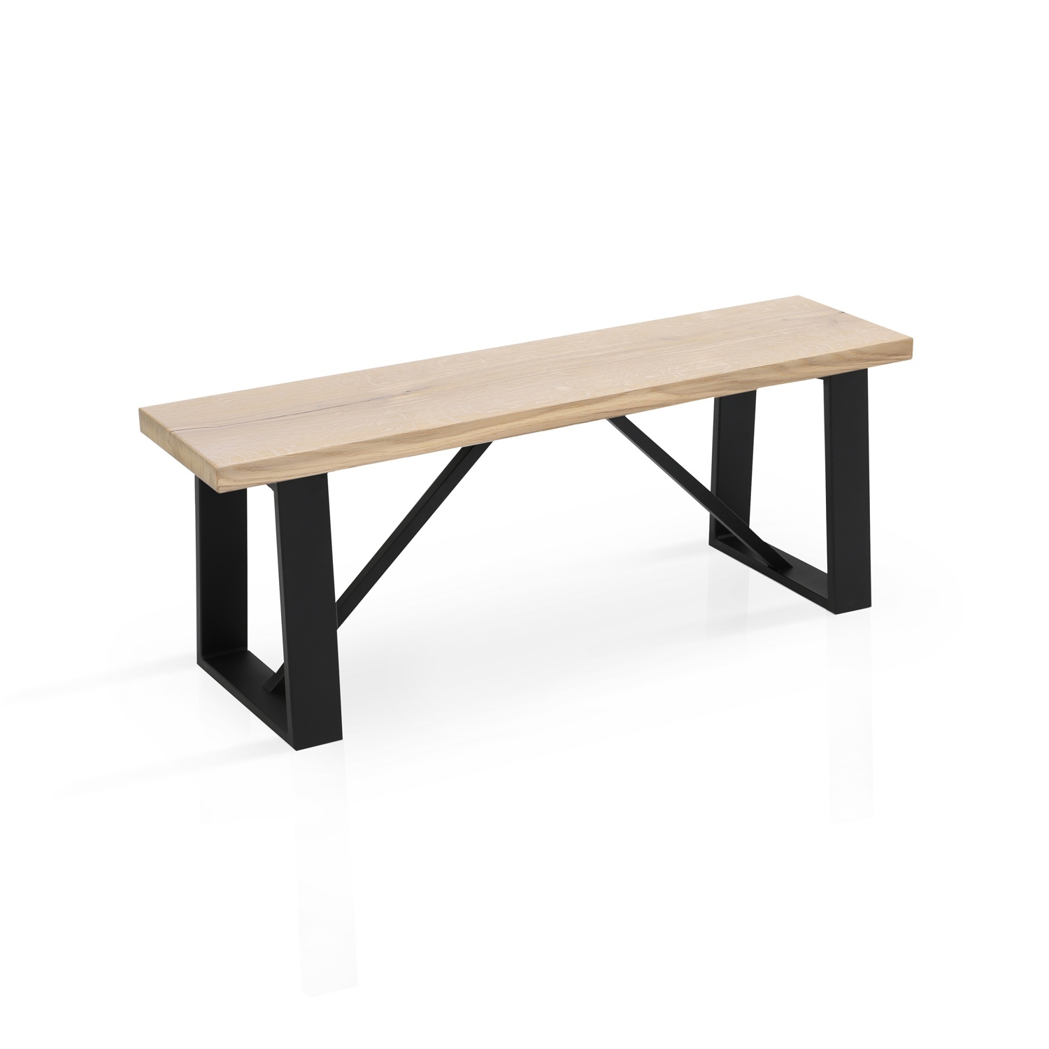 Журнальные столы и скамьи OLD OAK представлены в нескольких размерах. Столешница и сиденье изготавливают из дуба, в палитре три оттенка. Металлические опоры матовые или глянцевые могут быть чёрного или белого цвета. Параметры высоты стандартные: журнальный стол — 45 см, скамья — 45 см.