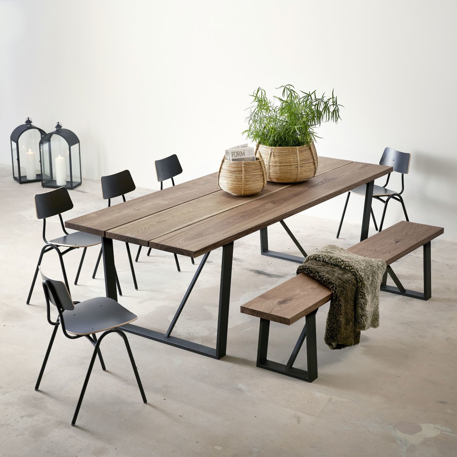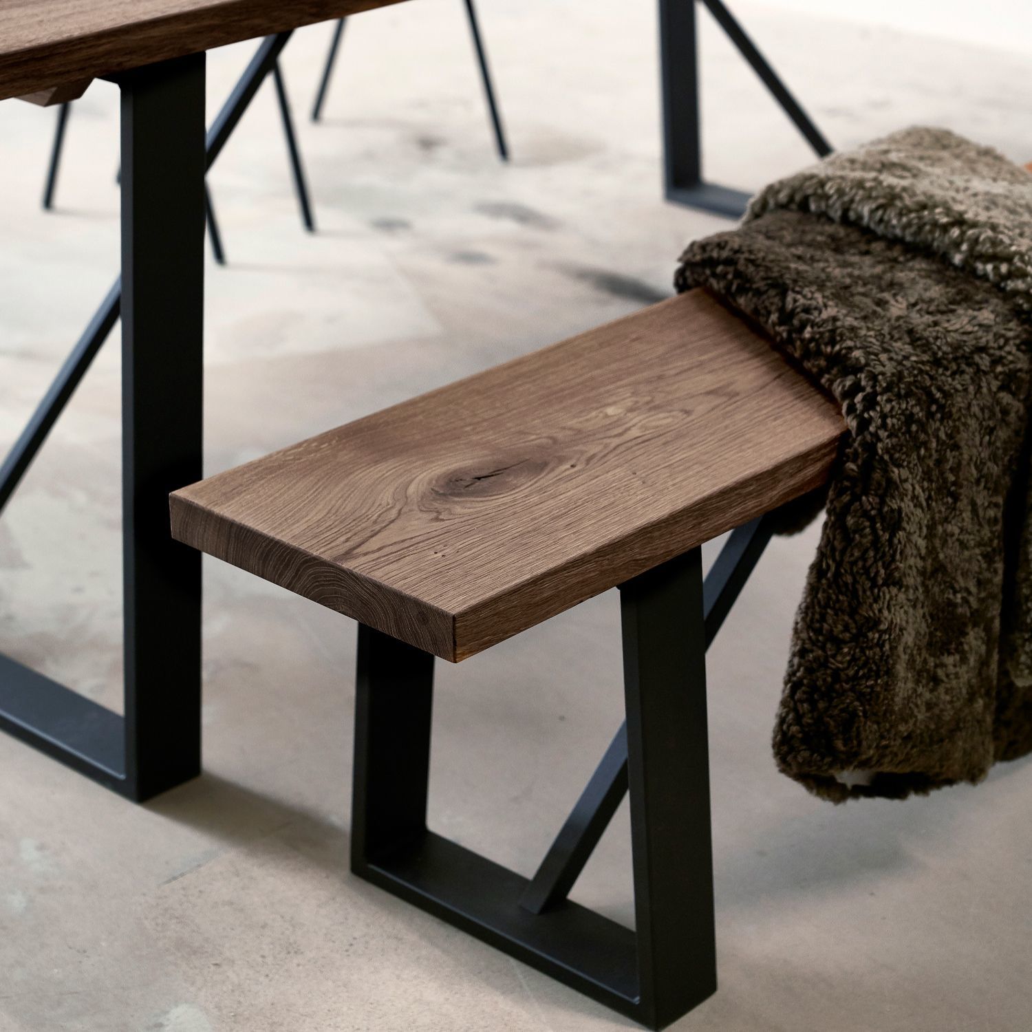 В дизайне OLD OAK присутствуют черты индустриального стиля: широкие металлические опорные конструкции, дубовые доски толщиной 40 мм — в центре внимания геометрия и фактура. В предметах по-разному использована равнобедренная трапеция. Опора предмета служит не только эстетическим качествам коллекции. Скамья устойчивее на длинном основании. Опора стола на коротком основании трапеции не станет болезненным препятствием. Кроме того, такое решение организует пространство между предметами, подчёркивает их принадлежность к одной коллекции. OLD OAK поможет выразить скандинавский минимализм, внесёт индустриальные штрихи в современные городские и загородные дома. Коллекция станет удачным решением для гостиной в помещениях в стиле лофт — бетонный пол и кирпич подчеркнут красоту дерева.