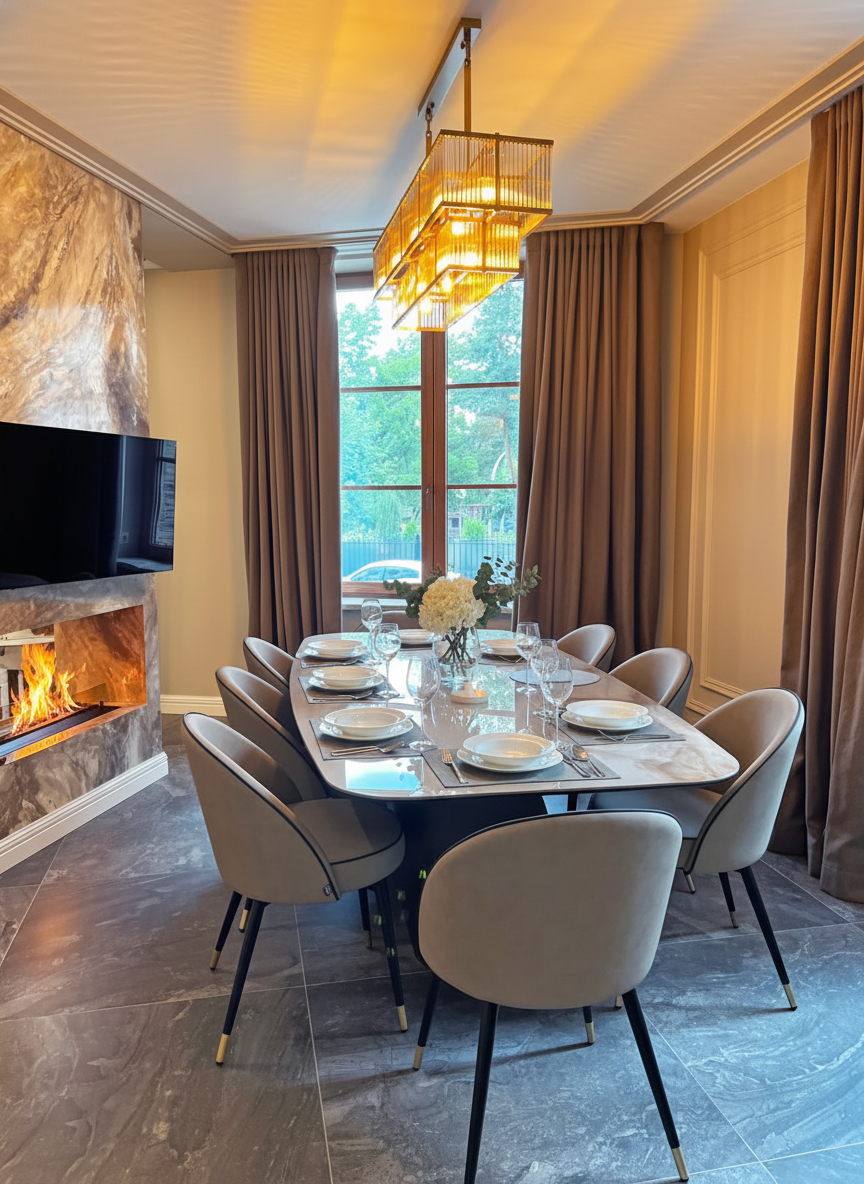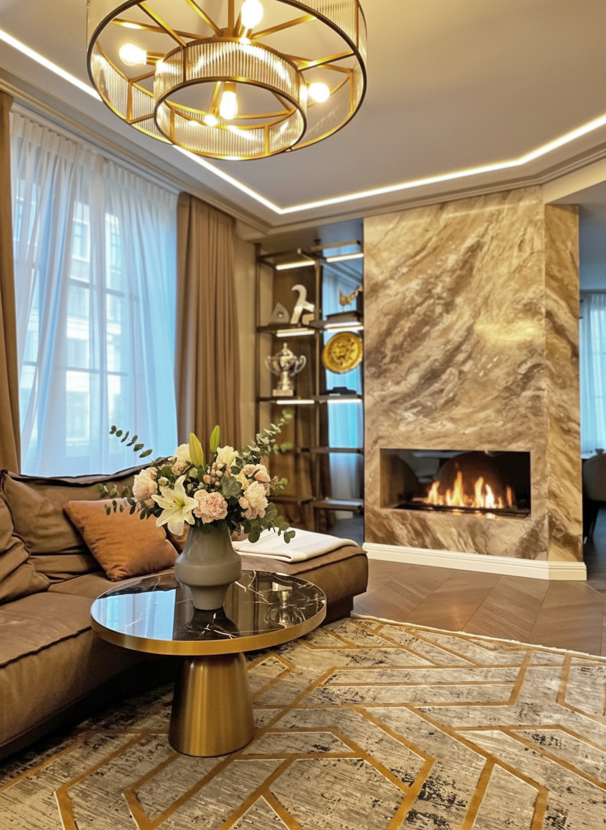 Гостиная разделена на две зоны: зона отдыха с домашним кинотеатром и кухня-столовая. Кухня-столовая отделена декоративной стеной со встроенным камином и декорированной венецианской мозаикой.