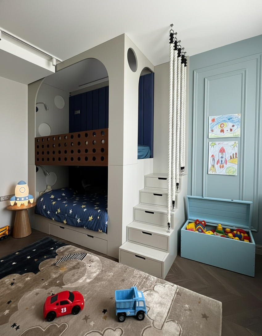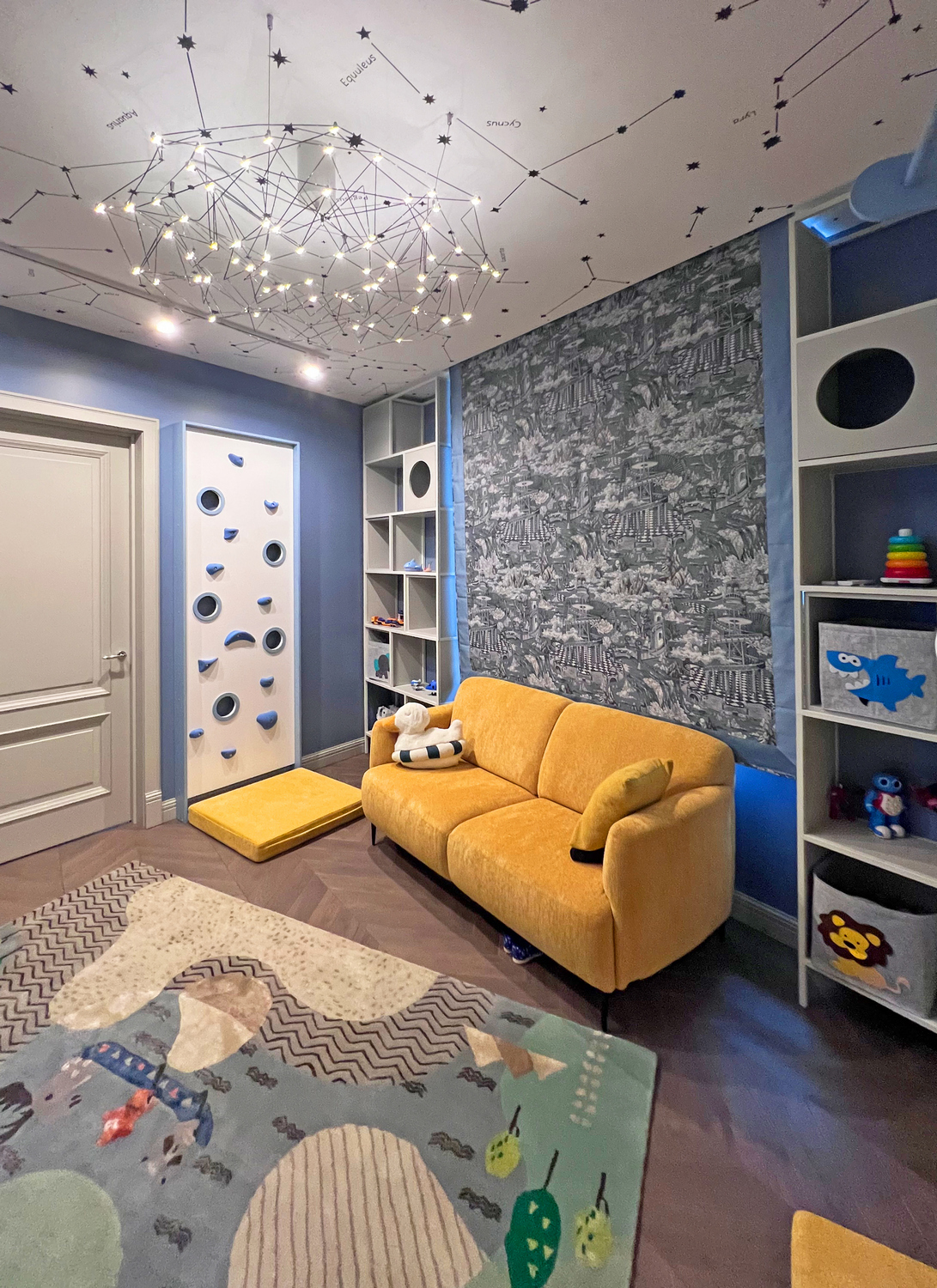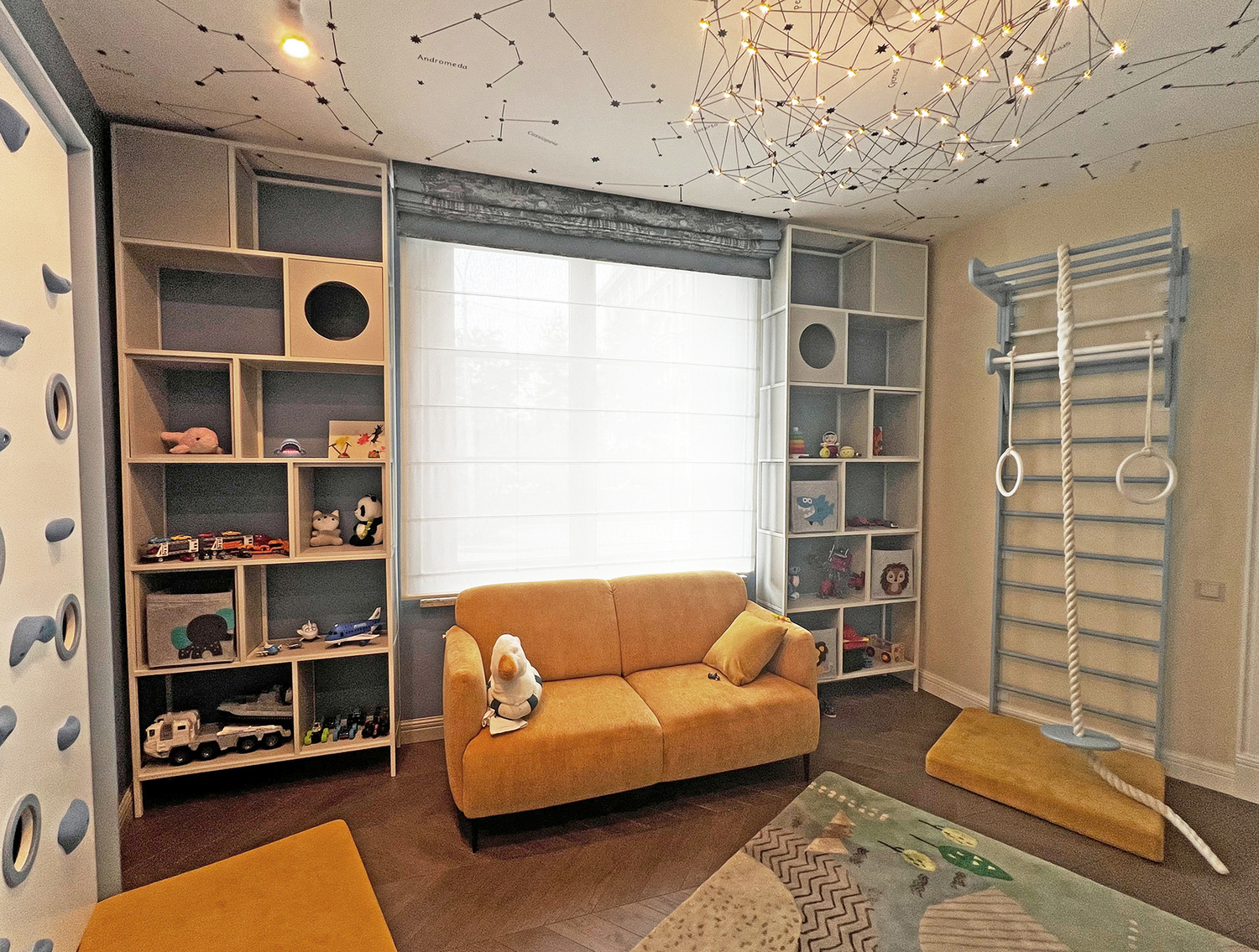 Особое внимание уделялось детским комнатам – игровой и двум детским комнатам. В игровой – настоящая роспись и комфортный, удобный диван CUDDLE от HAUSKA, который используется как для игр, так и для отдыха. Ярко-желтая, солнечная обивка прекрасно дополняет интерьер помещения.