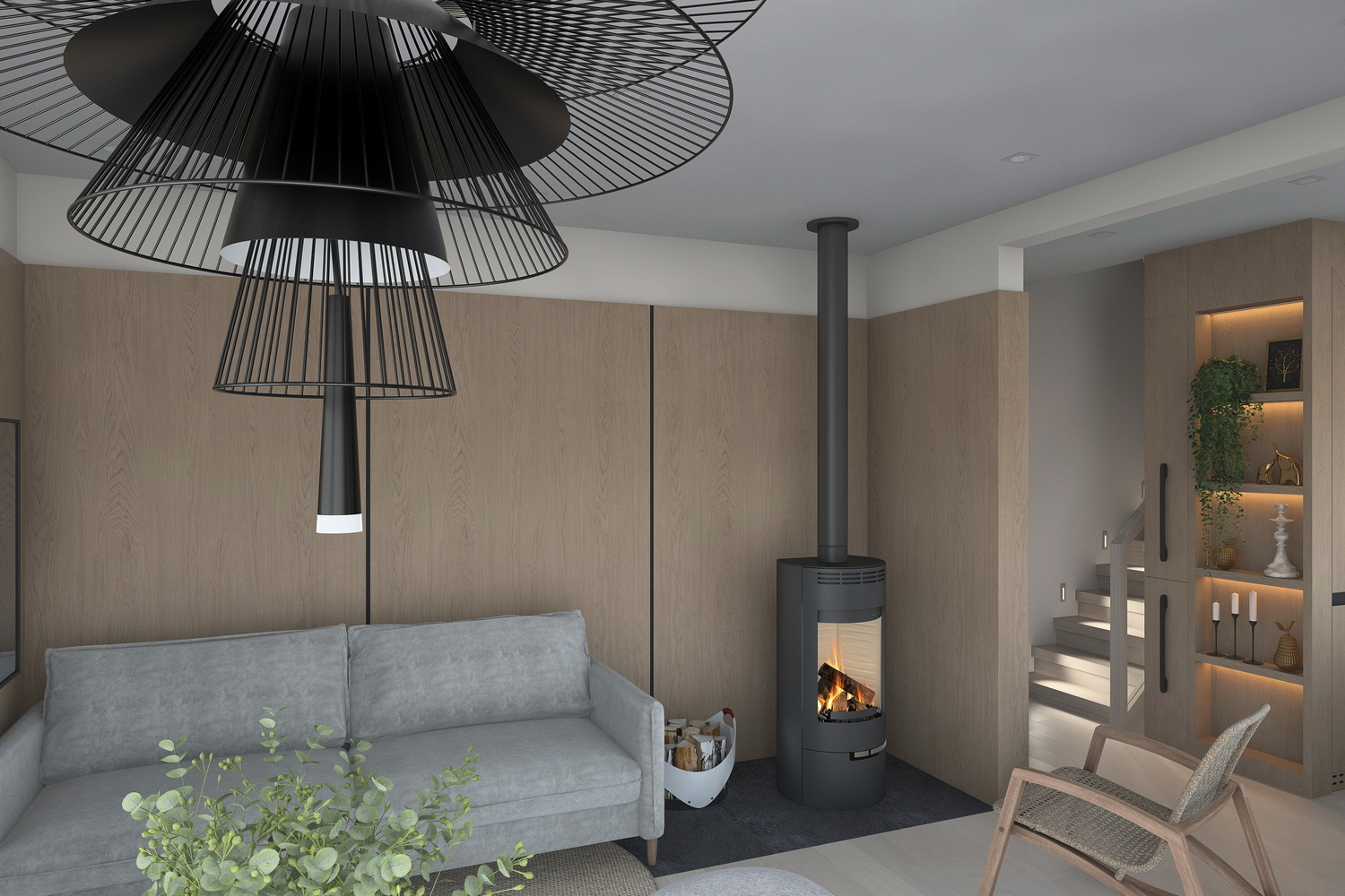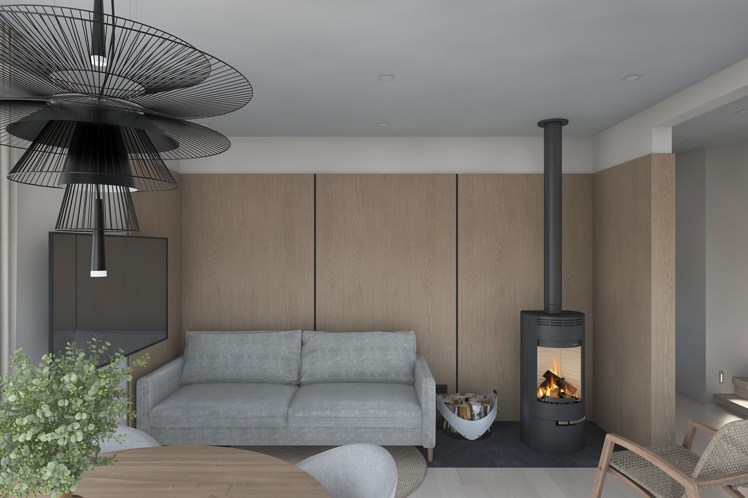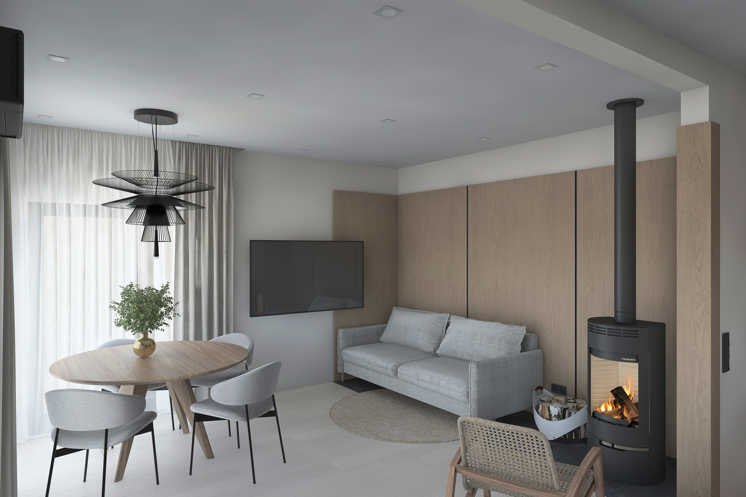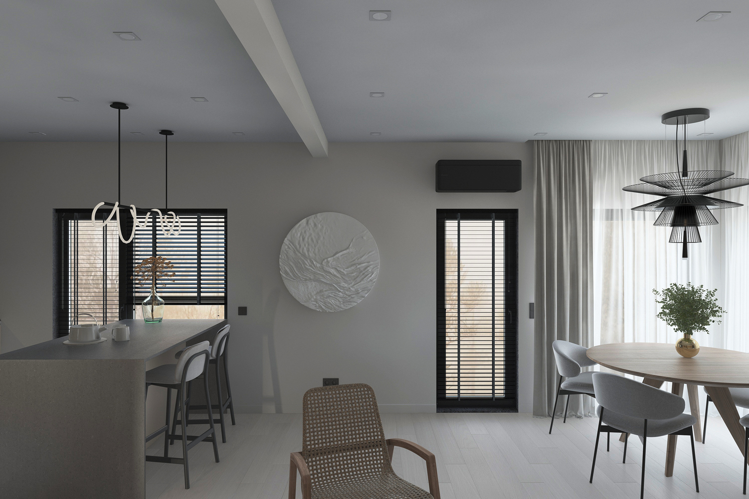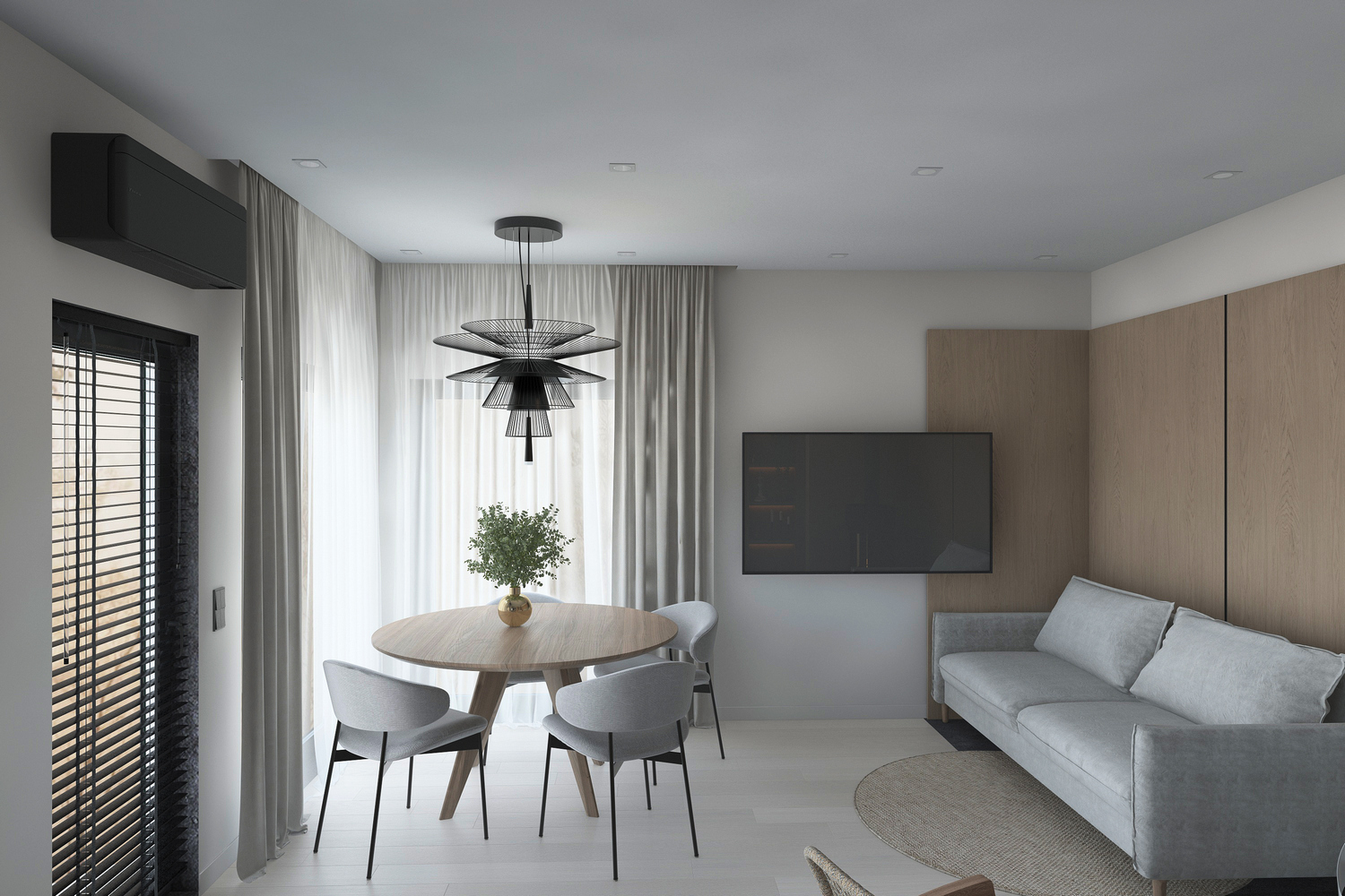 Интерьер выполнен в сдержанной светло-серой гамме с большим количеством деревянных поверхностей и черными элементами, что придает обстановке одновременно утонченность и лаконичную выразительность.