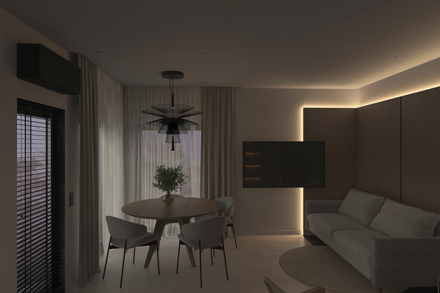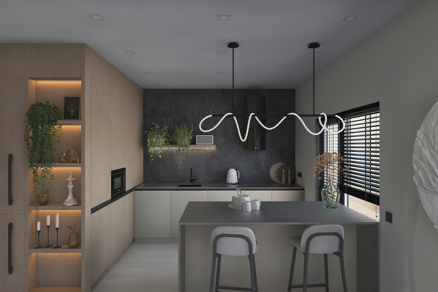 По пожеланию заказчиков для каждого помещения было разработано большое количество сценариев освещения – яркий потолочный свет, уютные декоративные подсветки и локальное освещение над рабочей поверхностью.