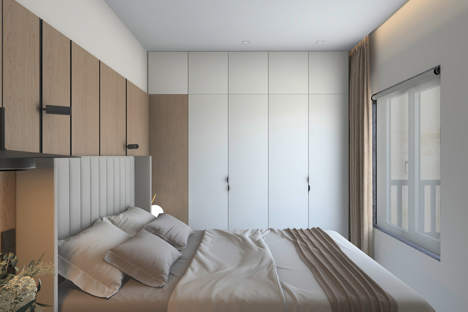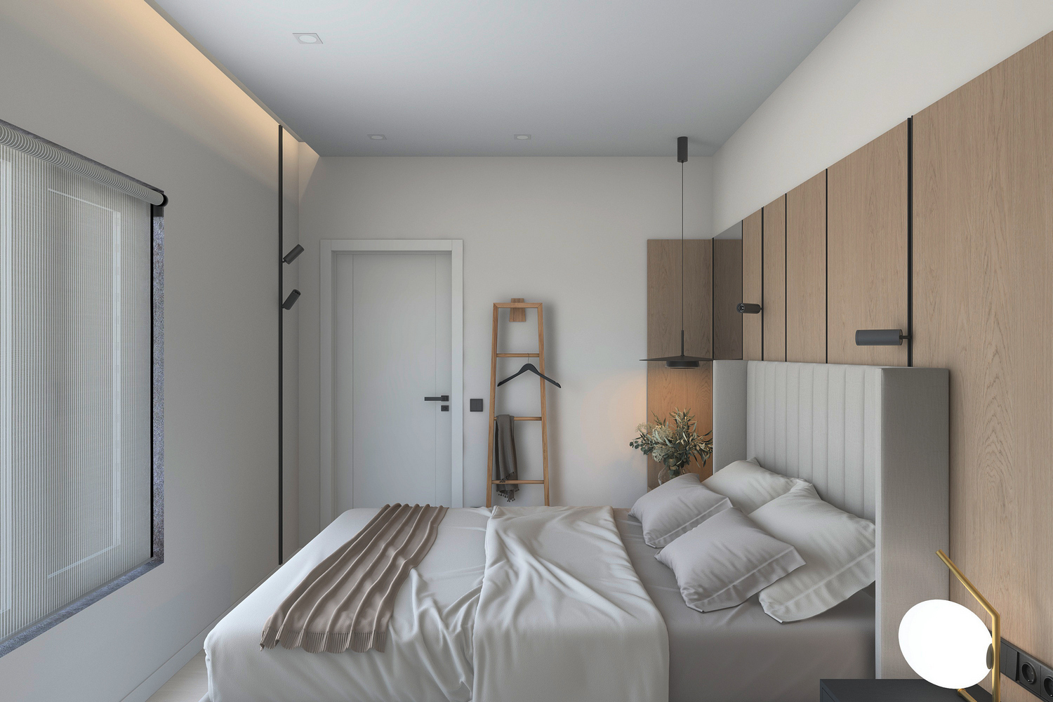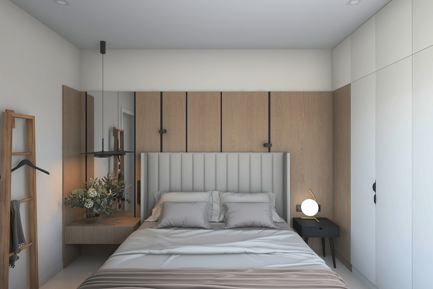 Площадь спальни – всего 10 квадратных метров. Несмотря на это, там удалось разместить полноценную двуспальную кровать со спальным местом 160×210 см и вместительный шкаф, глубиной 60 см, сохранив ощущение простора и порядка.