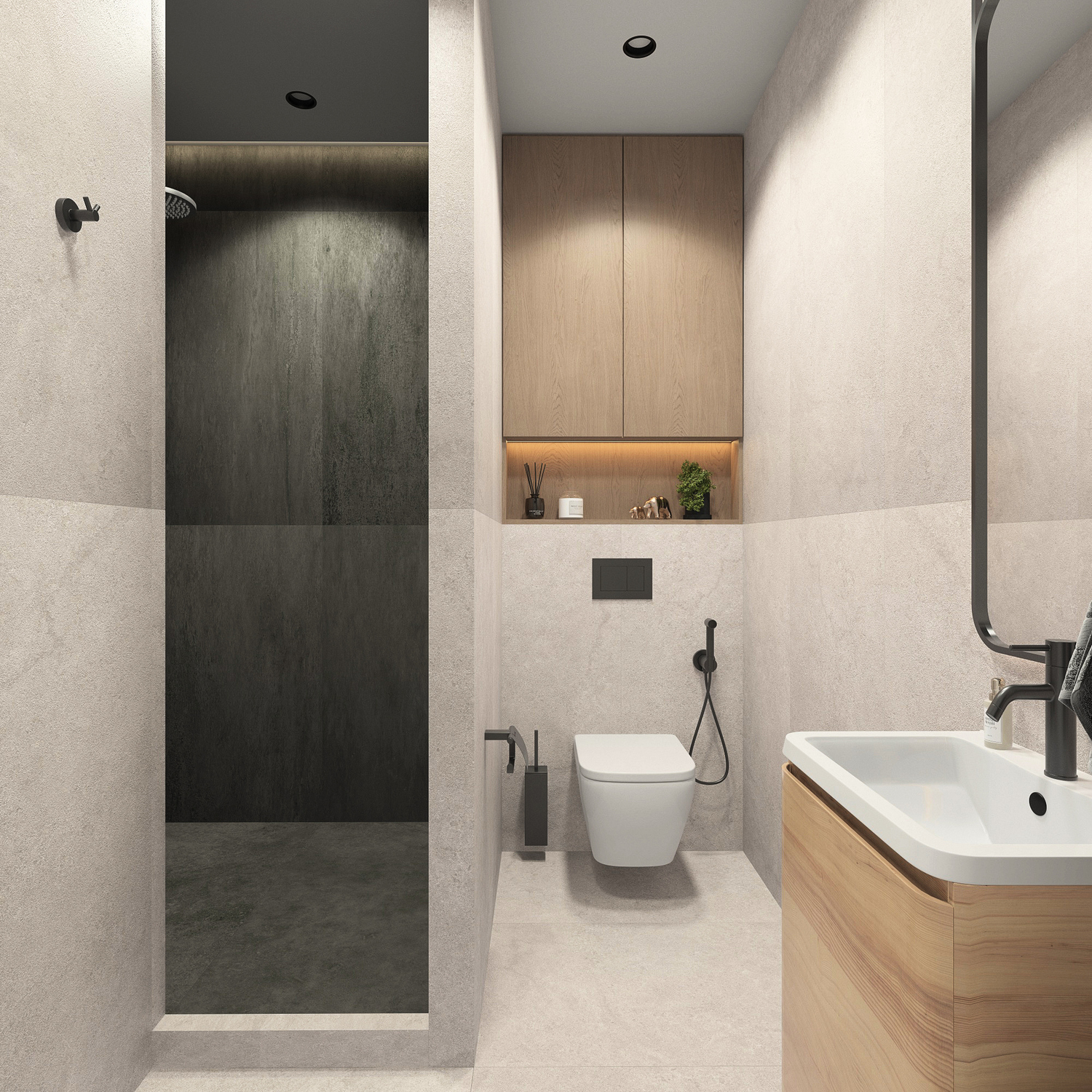 Компактный санузел (всего 4 м²) стал образцом продуманной эргономики: перегородка нестандартной формы, возведённая между санузлом и смежным техническим помещением, позволила выделить просторную душевую кабину размером 120×120 см, превратив ограниченное пространство в функциональную и эстетически гармоничную зону.